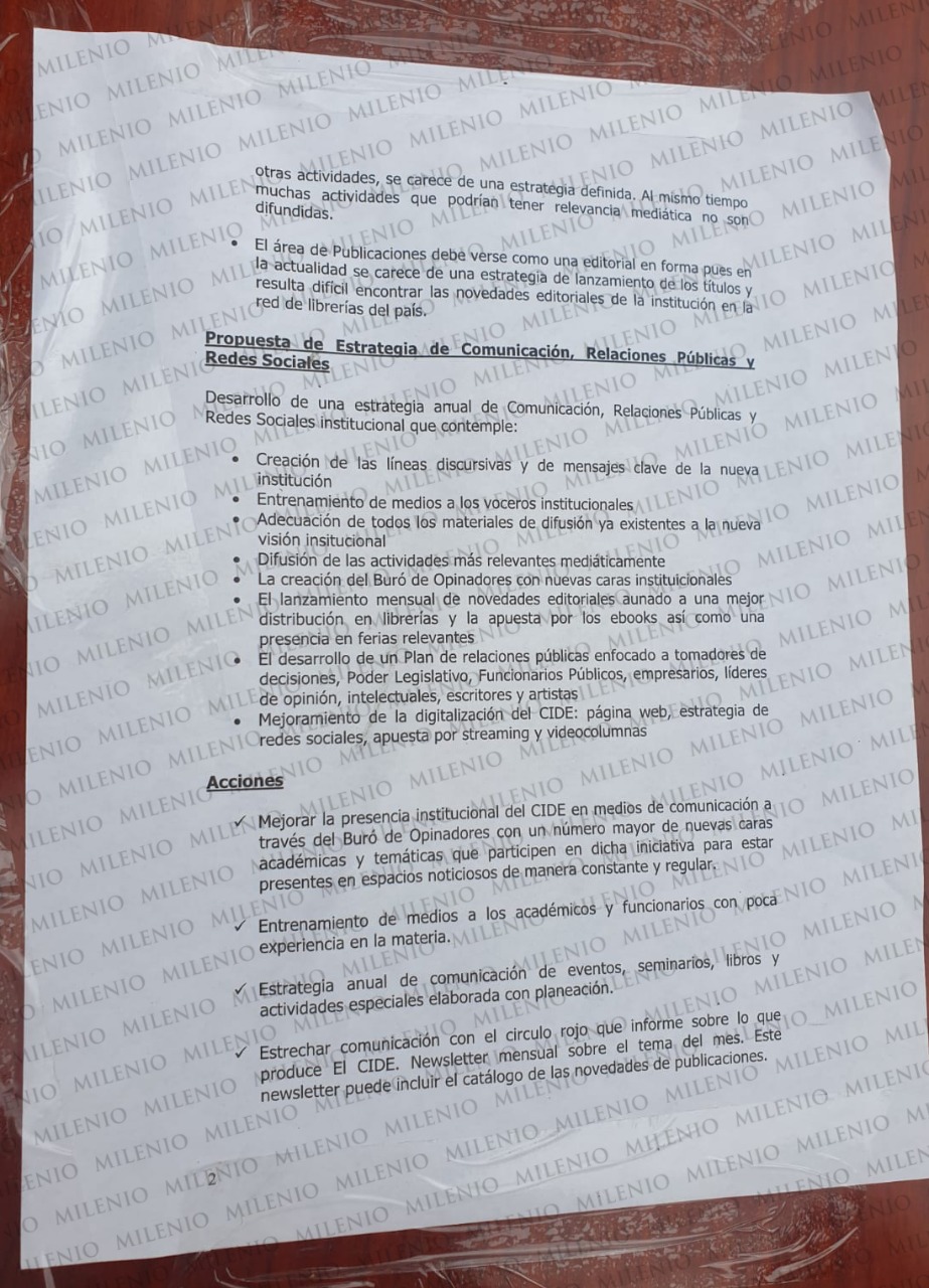 Ante ello, considera que "es indispensable comenzar de inmediato con una estrategia en materias de comunicación y relaciones públicas y redes sociales que por un lado relance al CIDE y por otro enfatice la nueva visión institucional post-conflicto".