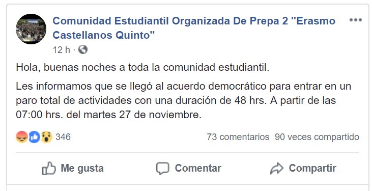 Alumnos de la Escuela Nacional Preparatoria 2 "Erasmo Castellanos Quinto" de la UNAM iniciaron un paro de actividades de 48 horas.
