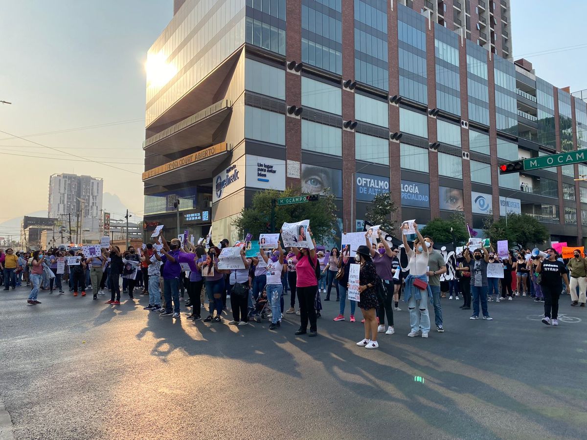 Un grupo de 550 personas encabezadas por la Asamblea Feminista protestaron hoy frente a la Fiscalía General de Justicia de Nuevo León, demandando justicia para las mujeres que están desaparecidas.