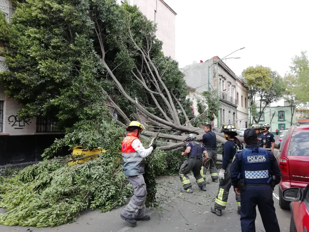 Un árbol de aproximadamente 12 metros de altura cayó al debilitarse la raíz entre Reforma y Riva Palacio en la colonia Guerrero, alcaldía Cuauhtémoc.