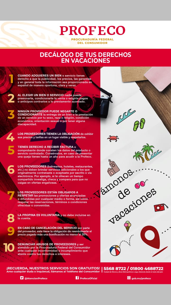 Así también dio a conocer el decálogo de los derechos de los vacacionistas que se conforma por diez puntos, en los que se encuentran diferentes sugerencias para estas vacaciones de Semana Santa, entre ellos, “al elegir un bien o servicio, nadie puede presionar, condicionar la venta o exigir pagos o anticipos de contratos a lo previamente acordado, ningún proveedor puede negar o condicionar la entrega de un bien o la prestación de un servicio sexo, raza o religión, condición económica, orientación sexual o por alguna discapacidad”.