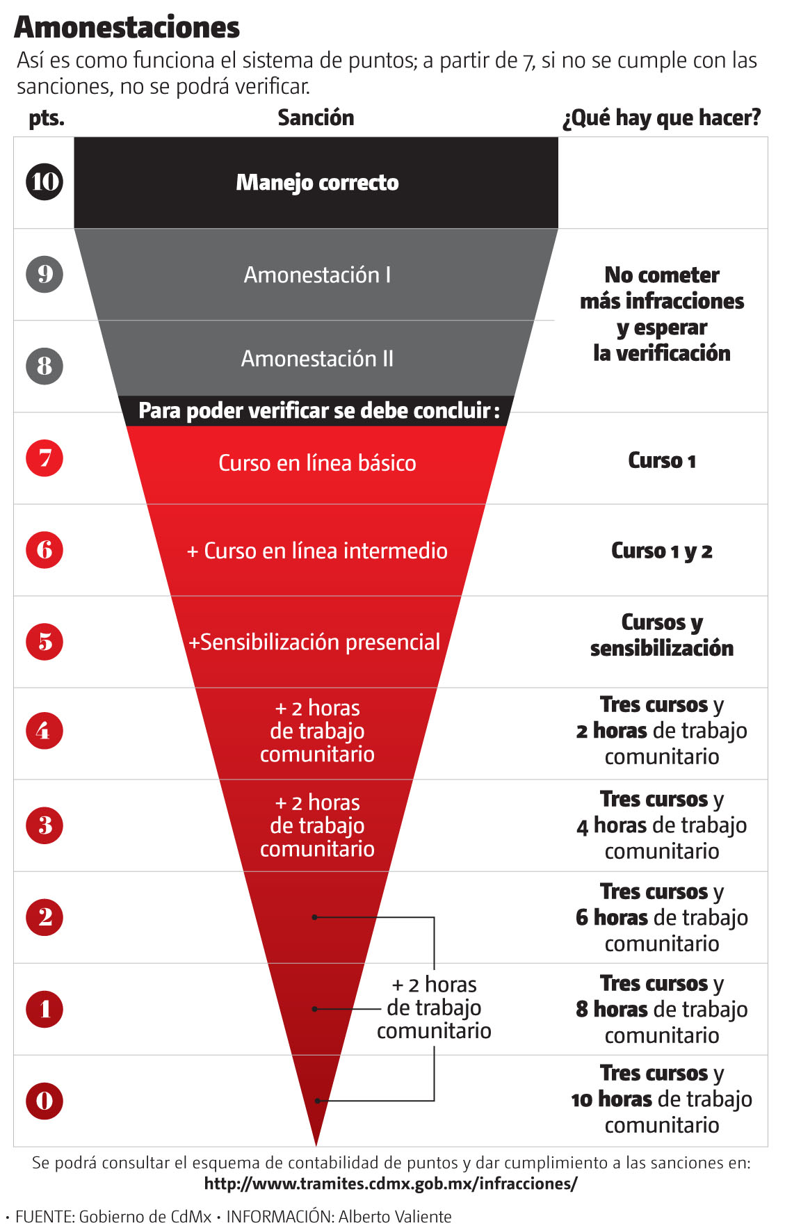 Las sanciones van desde amonestaciones en los primeros dos puntos y posteriormente comenzarán cursos en línea básicos, sensibilización presencial y trabajo comunitario; esto último hasta la sexta falta vial.