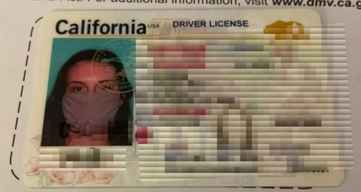 Lesley Pilgrim, de 25 años, recibió su licencia de conducir expedida por el DMV (Department of Motor Vehicles) de California con una foto de ella mientras portaba un cubrebocas.