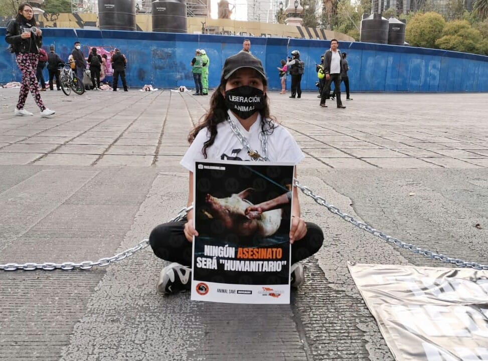 Integrantes del colectivo “Animal Save Ciudad de México” se manifiestan esta tarde en contra de los mataderos de animales en la capital.