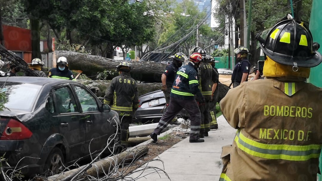 Personal del Heroico Cuerpo de Bomberos (HCB) realiza labores para retirar un árbol caído sobre Presa Salinillas y Presa Tepuxtepec, en la alcaldía Miguel Hidalgo, el cual cayó sobre un auto que se encontraba estacionado.