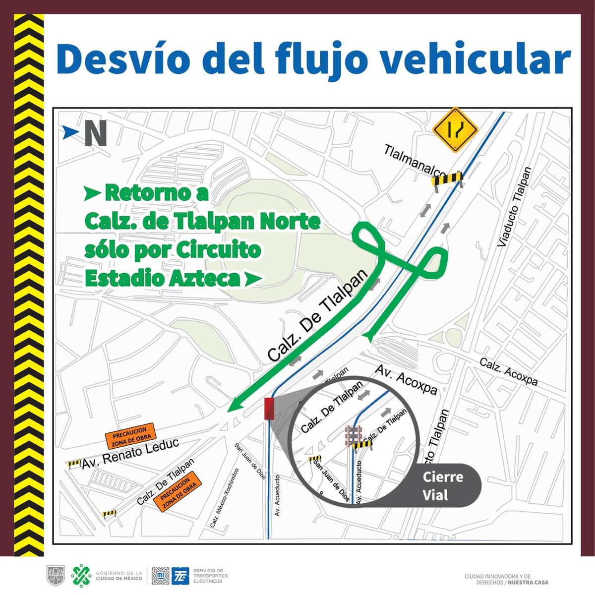 Igualmente, a los usuarios de esta vialidad de este punto que normalmente dan vuelta izquierda para ingresar a la sección o dar vuelta en u para regresar hacia el sur, se les solicita usar el paso a desnivel que está habilitado al frente del Estadio Azteca.