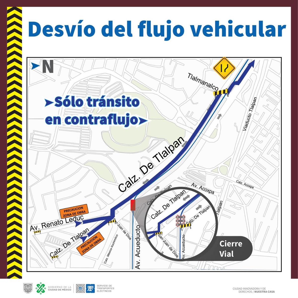 En el caso del transporte público y de carga se solicita que los vehículos que vienen de Renato Leduc y de Tlalpan hacia el norte, tomen por la avenida San Juan de Dios y la Av. Acueducto, habilitando un contrasentido para incorporarse lo que es la sección sur norte de Tlalpan hacia el Zócalo.