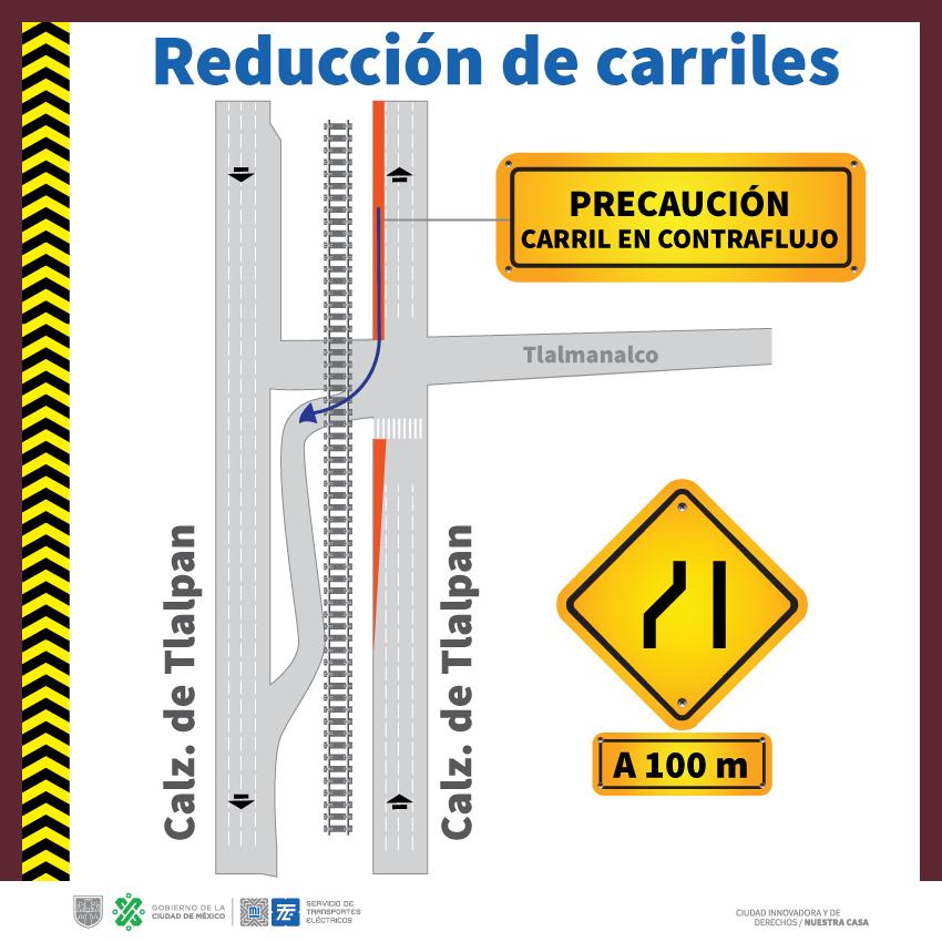 Por último, en Calzada de Tlalpan sentido norte-sur, a los vehículos que vengan del Zócalo hacia la salida Cuernavaca, se solicita atención a la altura de Tlalmanalco pues habrá la reducción de tres a dos carriles y se encontrarán a su mano izquierda con un contraflujo de los vehículos que tienen de sur a norte.