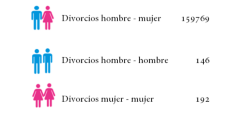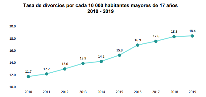 Datos de la Estadística de Divorcios 2019 del Instituto Nacional de Estadística y Geografía (Inegi) revelan que durante ese año se registraron 160 mil 107 divorcios y 504 mil 923 matrimonios; es decir, por cada 100 matrimonios ocurrieron 31.7 divorcios.