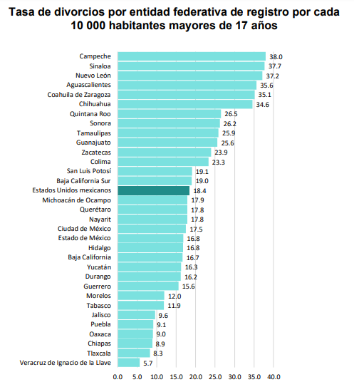 Las entidades que registraron las mayores tasas de divorcios por cada 10 mil habitantes en 2019 fueron Campeche con 38.0, Sinaloa con 37.7 y Nuevo León con 37.2. Mientras que los estados con menores tasas correspondieron a Veracruz con 5.7, Tlaxcala con 8.3 y Chiapas con 8.9.
