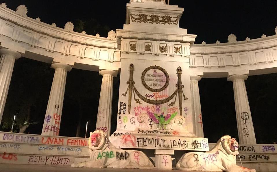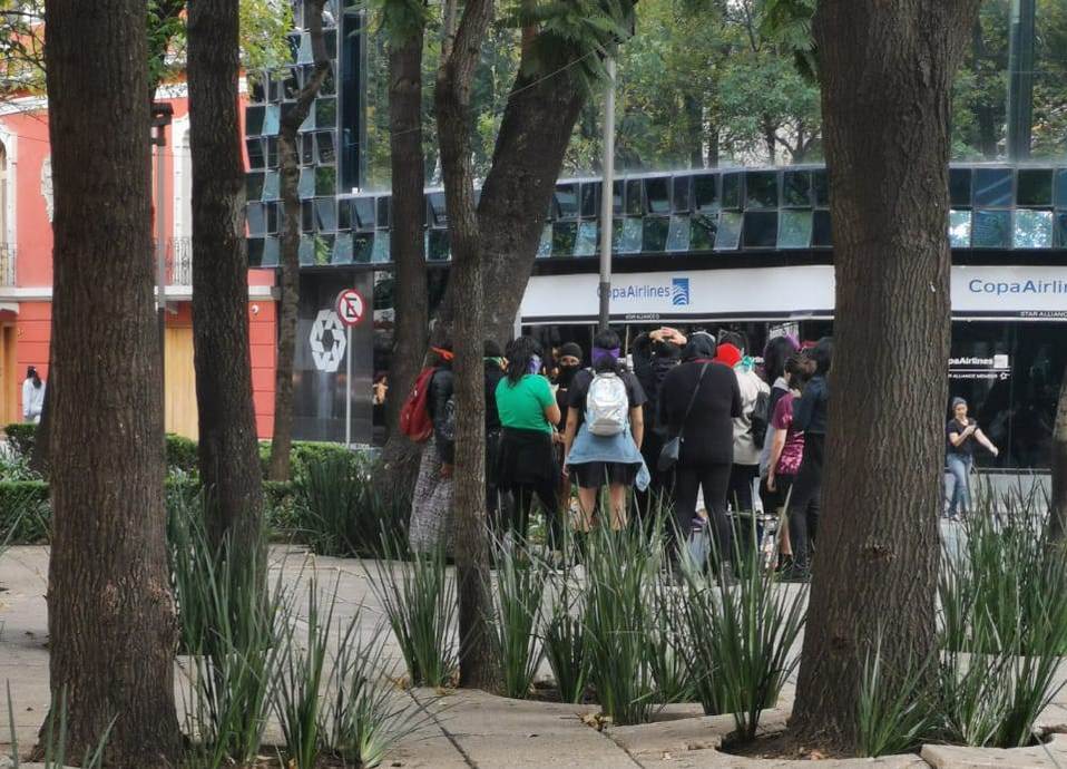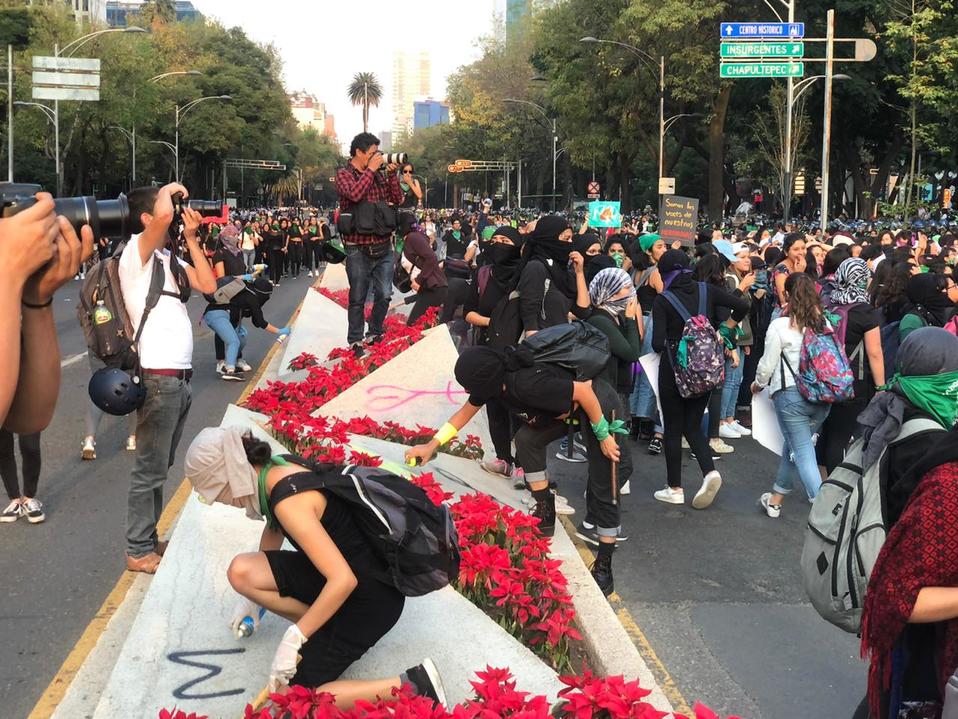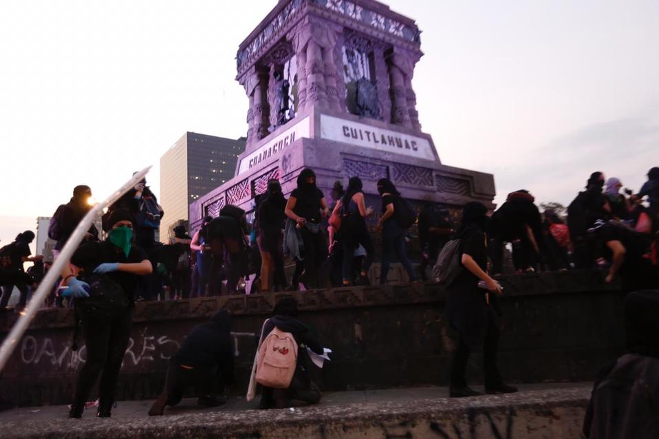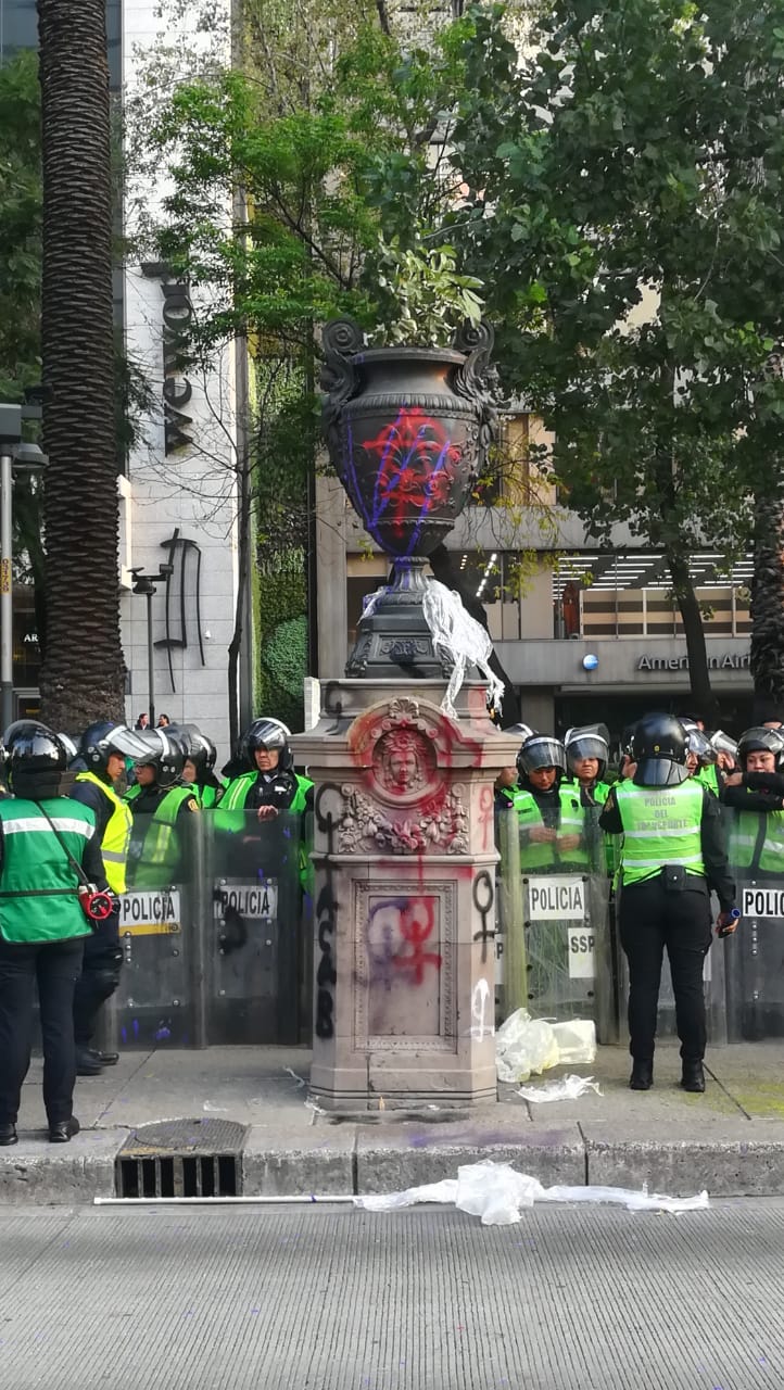 Previo al inicio de la marcha, encapuchadas rompen protección de esculturas y pintan camellón de Paseo de la Reforma.