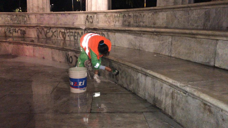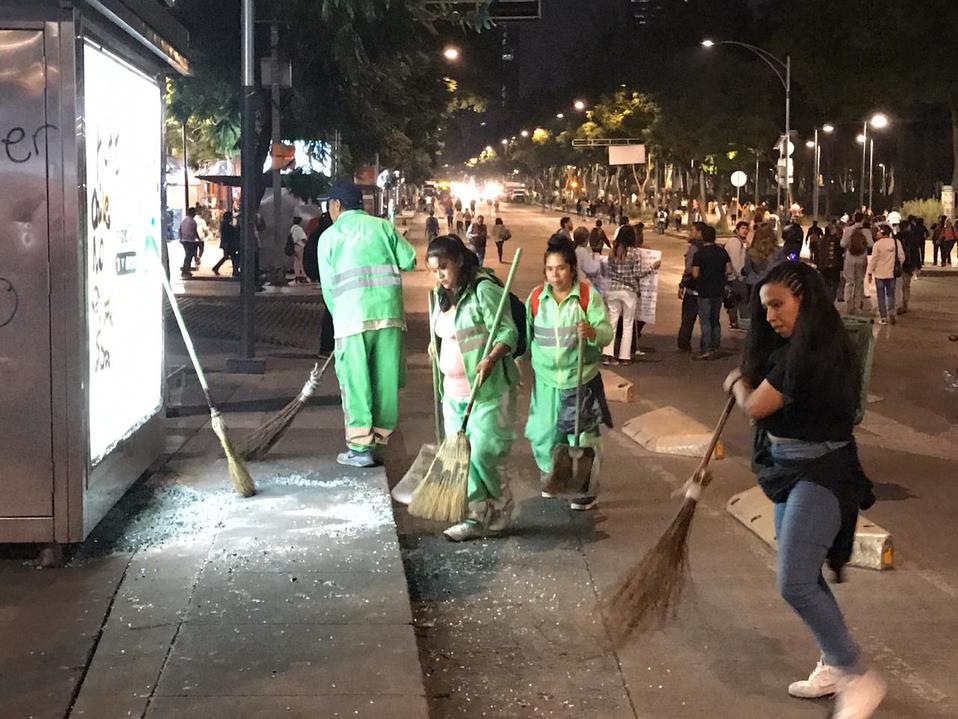 La Secretaría de Obras y Servicios desplegó un dispositivo con 50 elementos, 15 vehículos y dos barredoras para eliminar graffitis, así como realizar labores de barrido y limpia en la ruta donde se realizó la marcha.