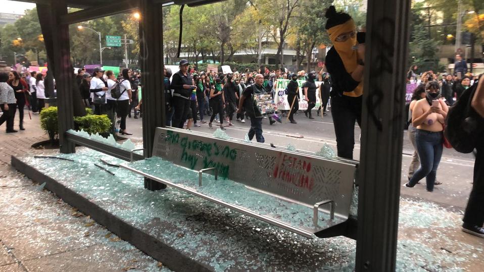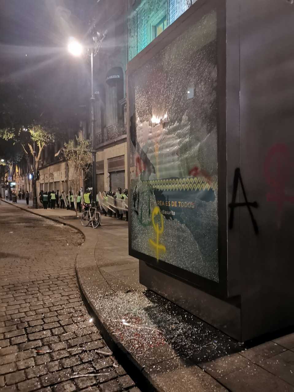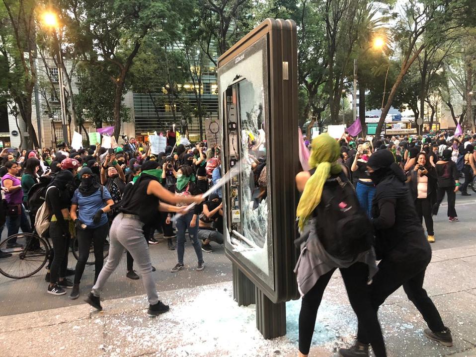 Encapuchadas rompen vidrios de anuncios ubicados en Paseo de la Reforma a la altura de Belgrado.