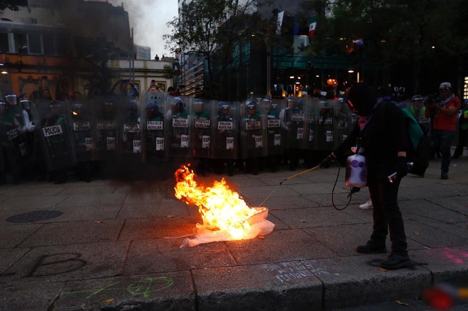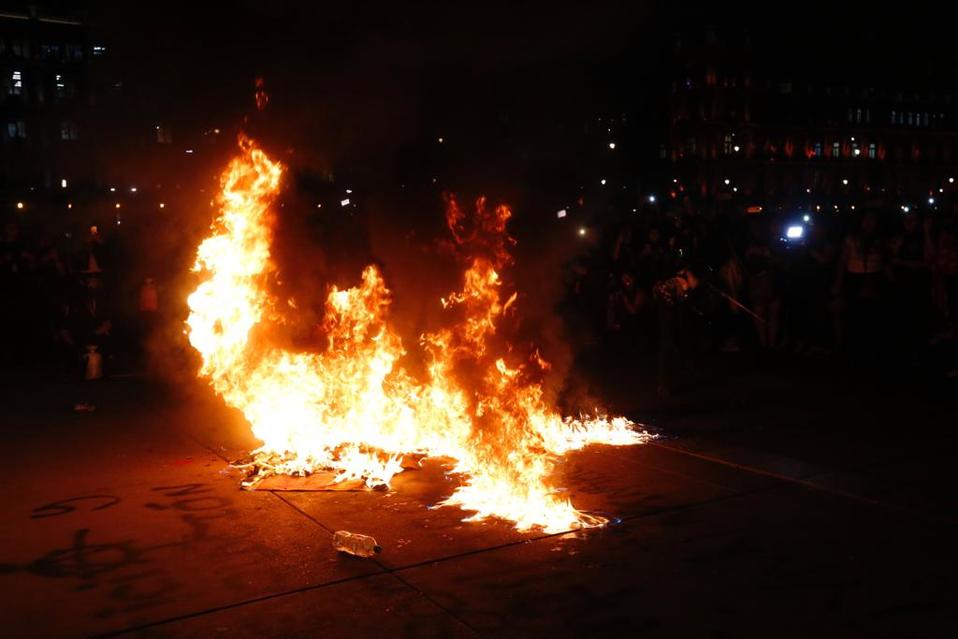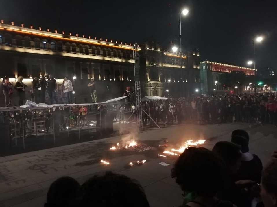 Encapuchadas realizaron la quema de un monigote en la plancha del Zócalo capitalino.