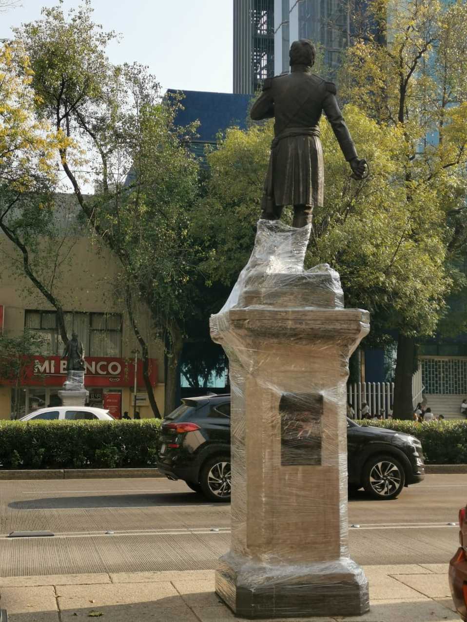 Pedestales de estatuas ubicadas en Paseo de la Reforma fueron protegidos con plásticos para evitar pintas durante la marcha.