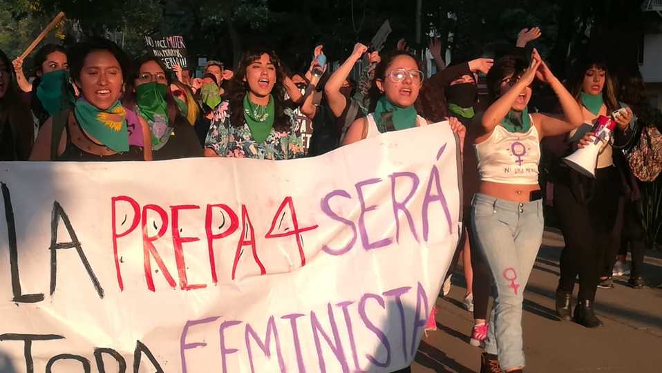 Contingente de la ENP 4 de la UNAM llegan con pancartas al Ángel de la Independencia para participar en la marcha.