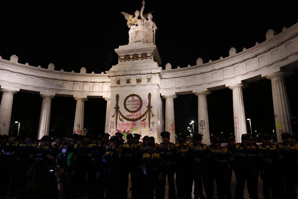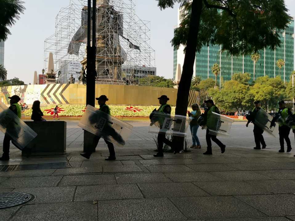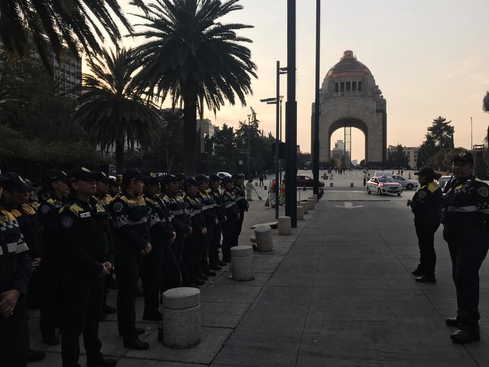 Elementos de la SSC resguardan las inmediaciones del Monumento a la Revolución, donde se realizará a las 18:00 horas una velada en memoria de las víctimas de feminicidio.