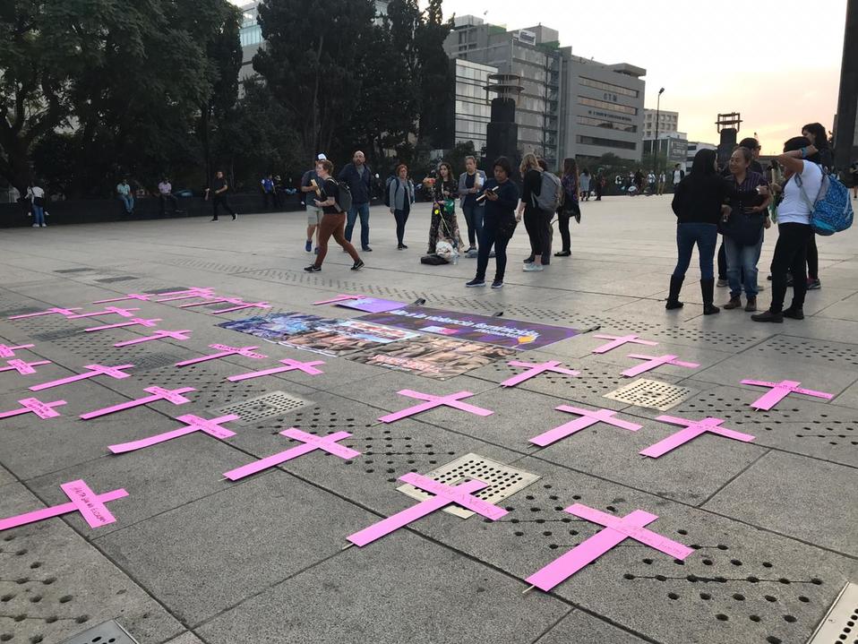 Familiares de víctimas de feminicidios colocaron veladoras y retratos de mujeres en la Antimonumenta, ubicado en avenida Juárez.