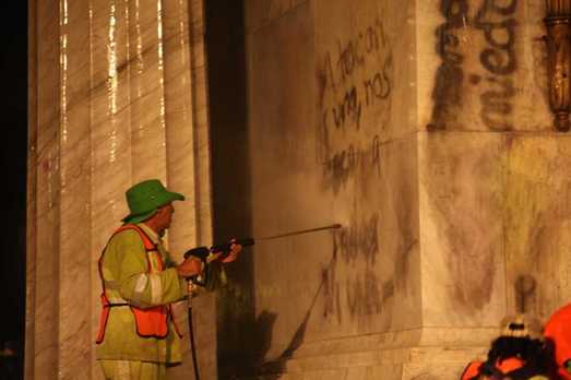 Personal de limpieza del gobierno capitalino realiza labores en la Gloriera de la Palma tras el paso del contingente.