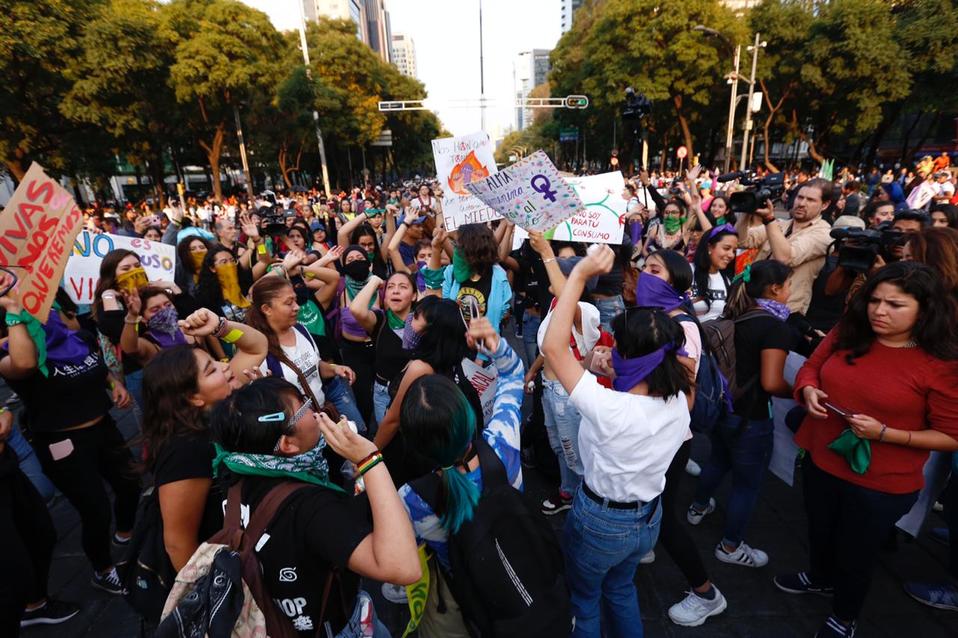 Grupos de mujeres continúan llegando a la glorieta del Ángel de la Independencia para marchar rumbo al Zócalo.