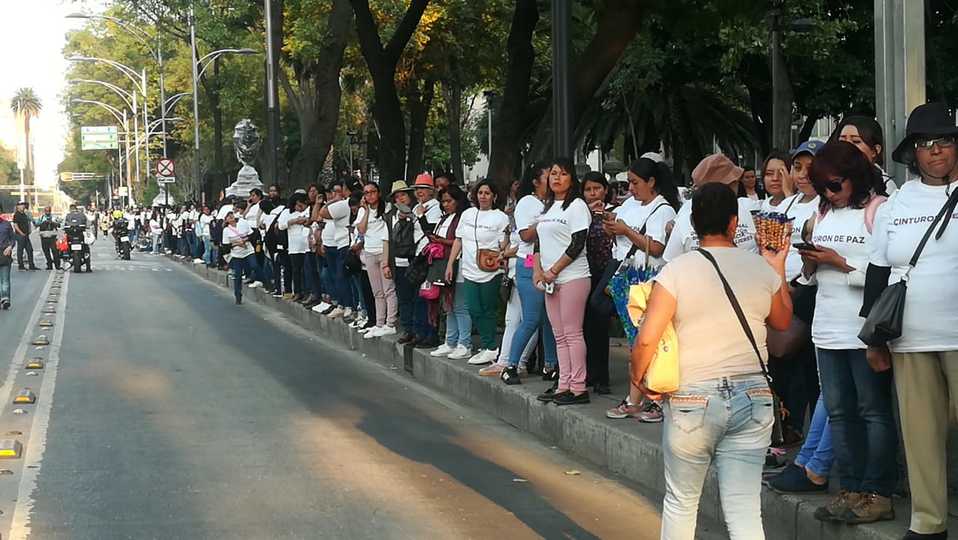 Trabajadoras de alcaldías y del gobierno capitalino llegan a Reforma con playera blanca para formar Cinturón de Paz para evitar actos vandálicos durante la manifestación.