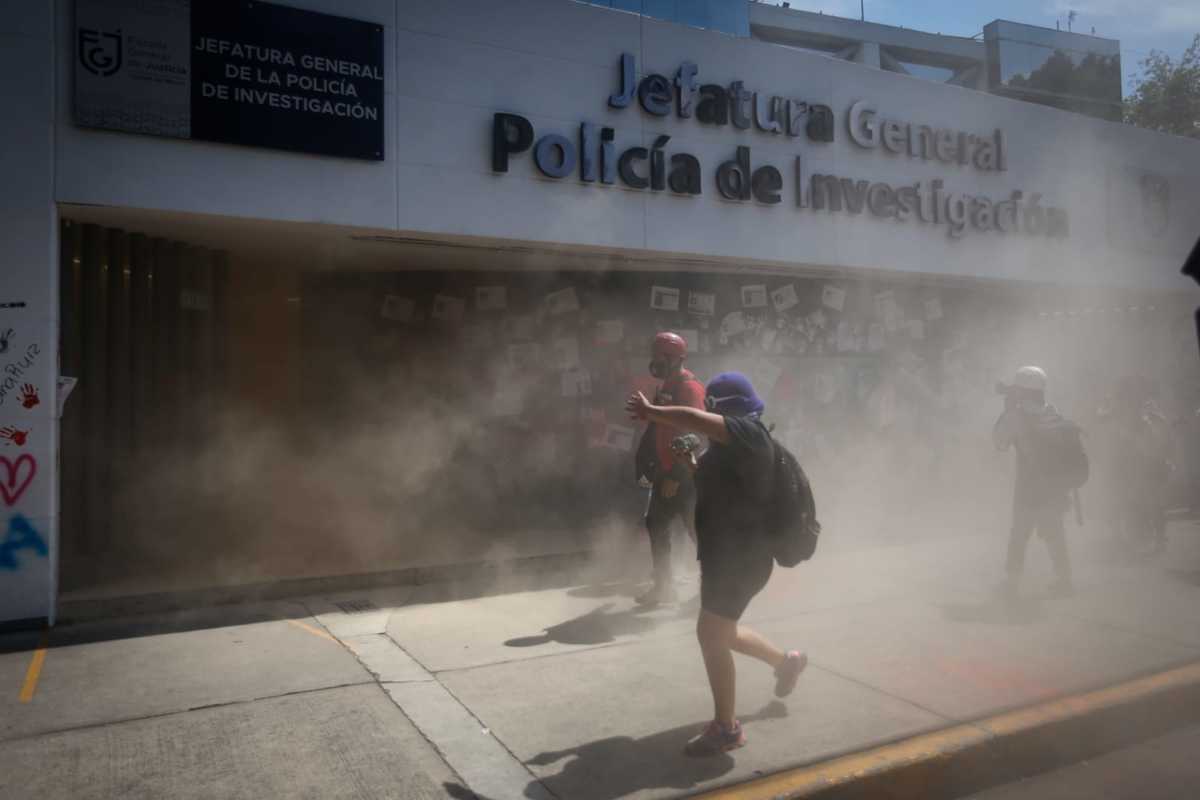 En su camino a la Fiscalía de Feminicidio de la FGJ CdMx, las manifestantes hicieron una parada afuera de las oficinas de la Policía de Investigación, donde realizaron pintas y pegaron pancartas.