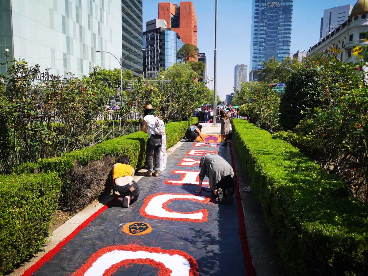 Con un tapete con la leyenda "México Feminicida" iniciaron la construcción de este altar que busca visibilizar la violencia contra la mujer que se vive en el país y asimismo han realizado papel picado con la leyenda "México - Fue el Estado".