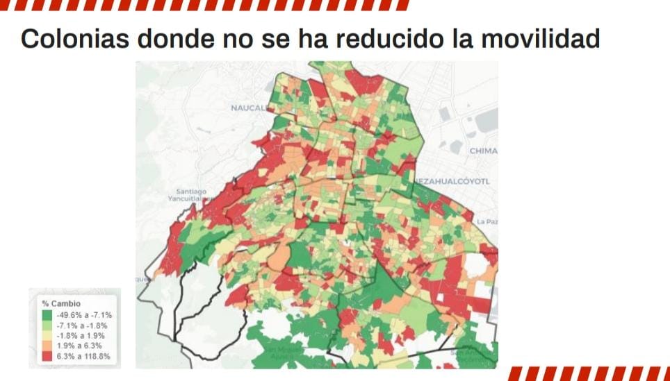 “Esto lo que mide es el cambio en el número de usuarios en las antenas dentro de las colonias, que es una buena medida de cuántas personas se mueven, que salen y entran a la colonia porque, evidentemente, cuando es constante, por ejemplo, pues son las zonas residenciales, pues por supuesto ahí el número de dispositivos es constante”, comentó.