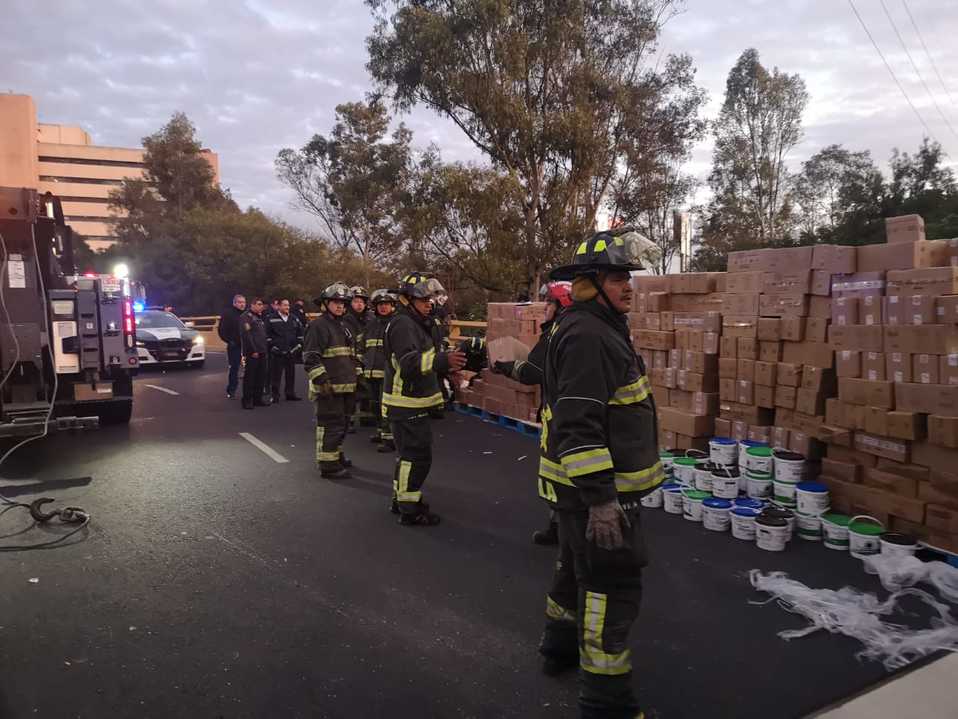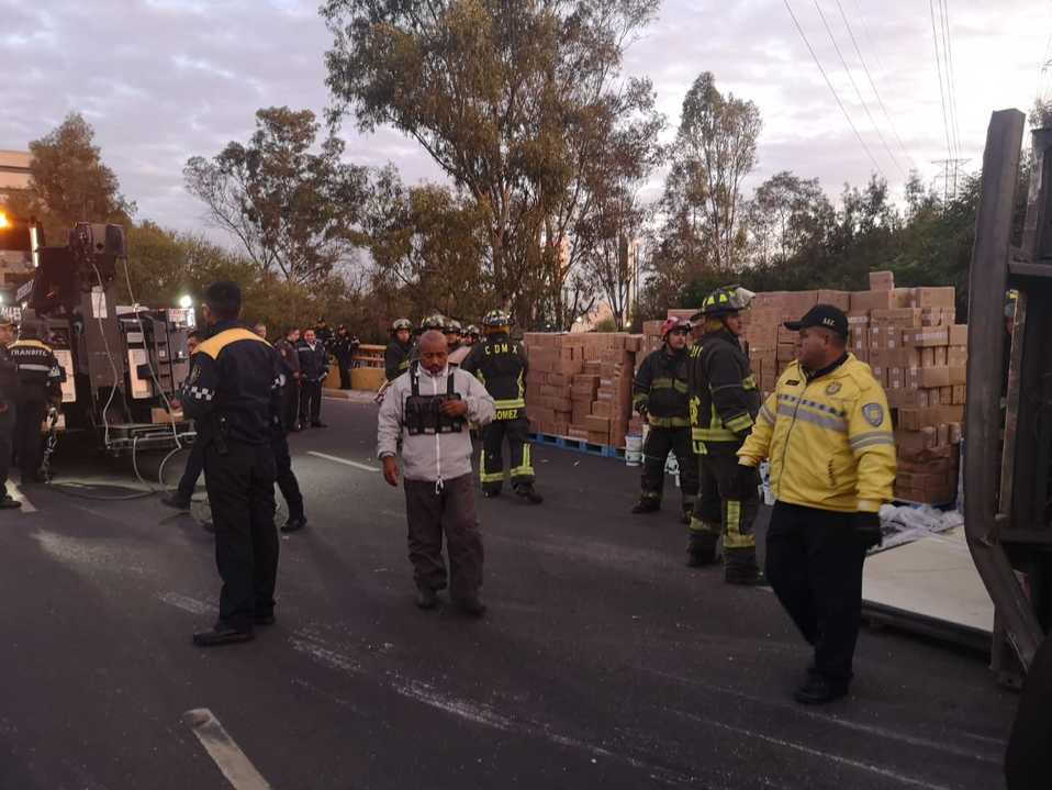 Un tráiler de 18 llantas con caja cerrada que transportaba 20 toneladas de productos lácteos se volcó sobre el Circuito Interior a la altura de La Raza.
