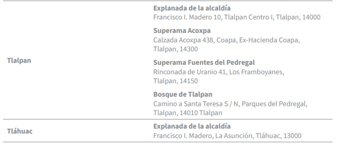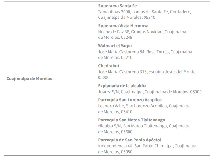 Por su parte, la alcaldía Cuajimalpa contará con ocho centros de acopio a lo largo de su territorio, estos servicios se encontrarán en la explanada de la alcaldía, en las iglesias de San Mateo Tlaltenango y San Lorenzo Acopilco; en las tiendas Walmart El Yaqui, Chedraui Jesús del Monte, Superama Vista Hermosa y Santa Fe y en el Kiosco de San Pablo Chimalpa.
