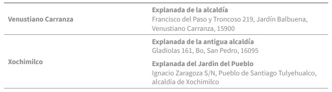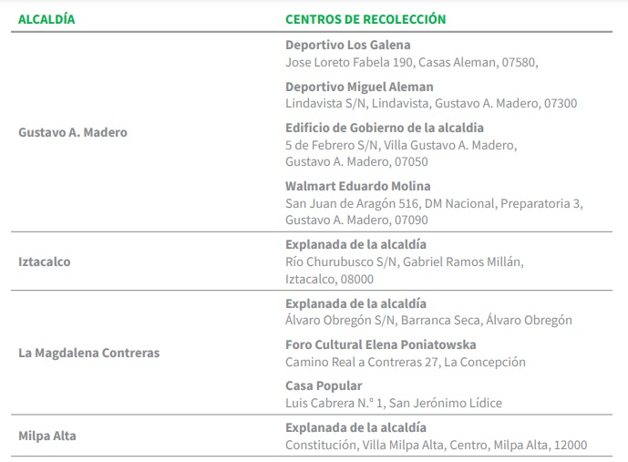 En el caso de la alcaldía Cuauhtémoc los puntos de acopio se encuentran en la explanada y en la dirección territorial Roma-Condesa, en Azcapotzalco la ubicación se encuentra a un costado del parque Tezozómoc, y darán servicio de lunes a domingo en horario de 09:00 a 16:00 horas.