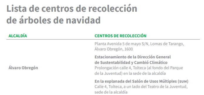 Con el programa "Árboles que dan vida", la Sedema invitó a las y los capitalinos a que lleven su árbol natural a los centros de acopio ubicados en las alcaldías Álvaro Obregón, Cuauhtémoc, Benito Juárez, Azcapotzalco, Cuajimalpa, Gustavo A. Madero, Iztacalco, Magdalena Contreras, Milpa Alta, Tlalpan, Tláhuac, Venustiano Carranza y Xochimilco.