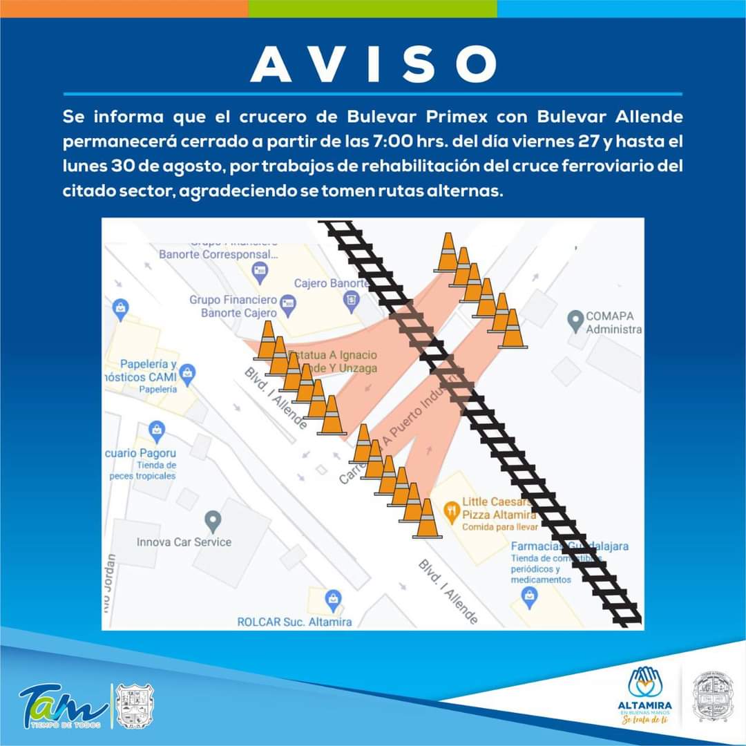 Cierran acceso principal hacia el bulevar Primex en el municipio de Altamira, por lo que conductores de unidades particulares, transporte público y de carga toman vías alternas, ya que se realiza el mantenimiento de las vías del ferrocarril.