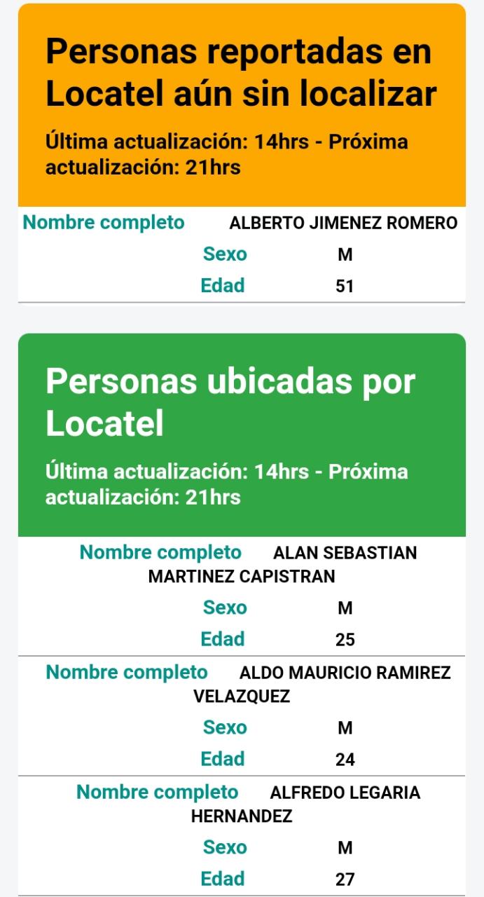 Hasta las 21:00 horas de este miércoles, sumaban nueve personas en Locatel aún sin localizar: cinco hombres y cuatro mujeres. Al corte de las 09:00 horas, cinco nombres figuraban en la lista: Alberto Jiménez Romero, de 51 años; Amairani Ivani Bolaños, de 23; Armando Rodríguez García, de 32; Fernando Gustavo Carmona Rosas, de 39, y José Hernández Reyes, de 56 años.