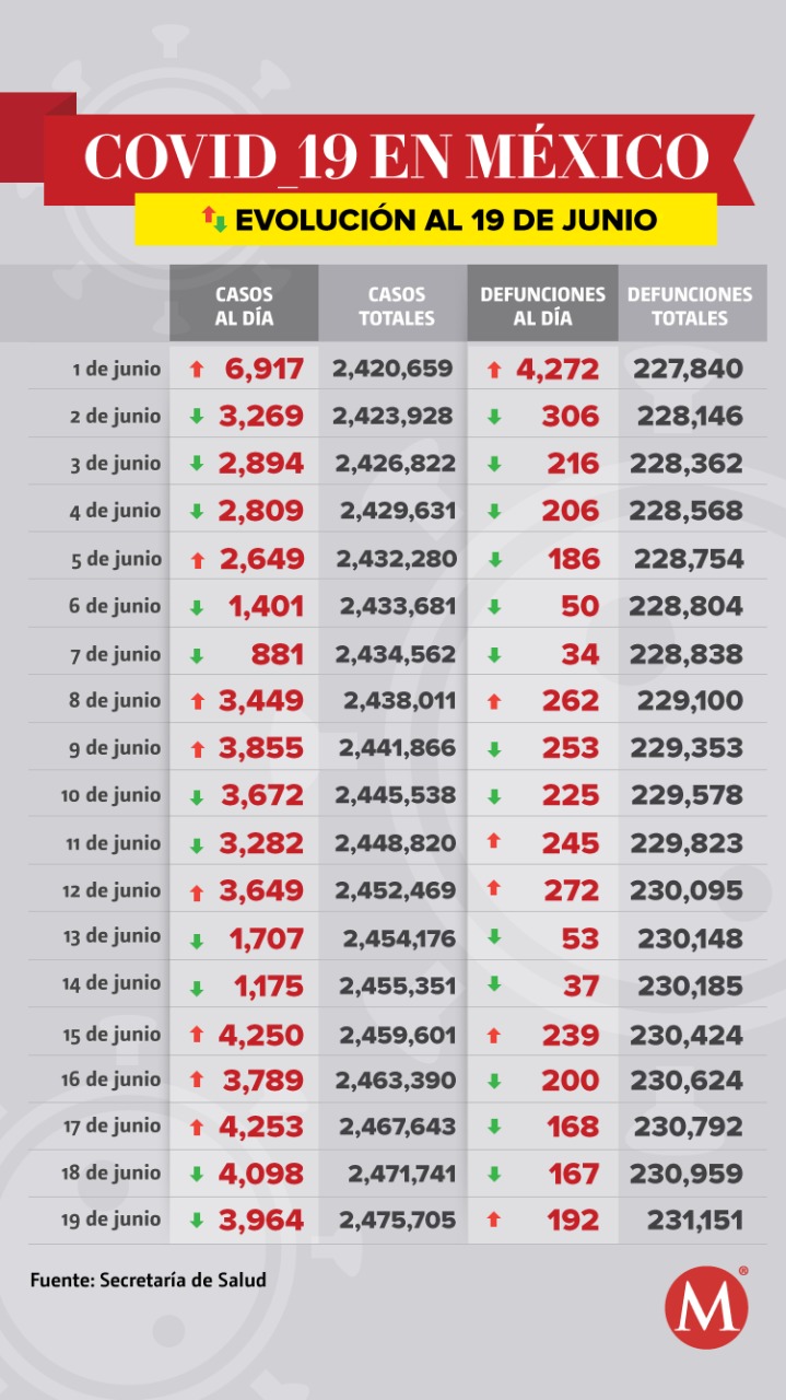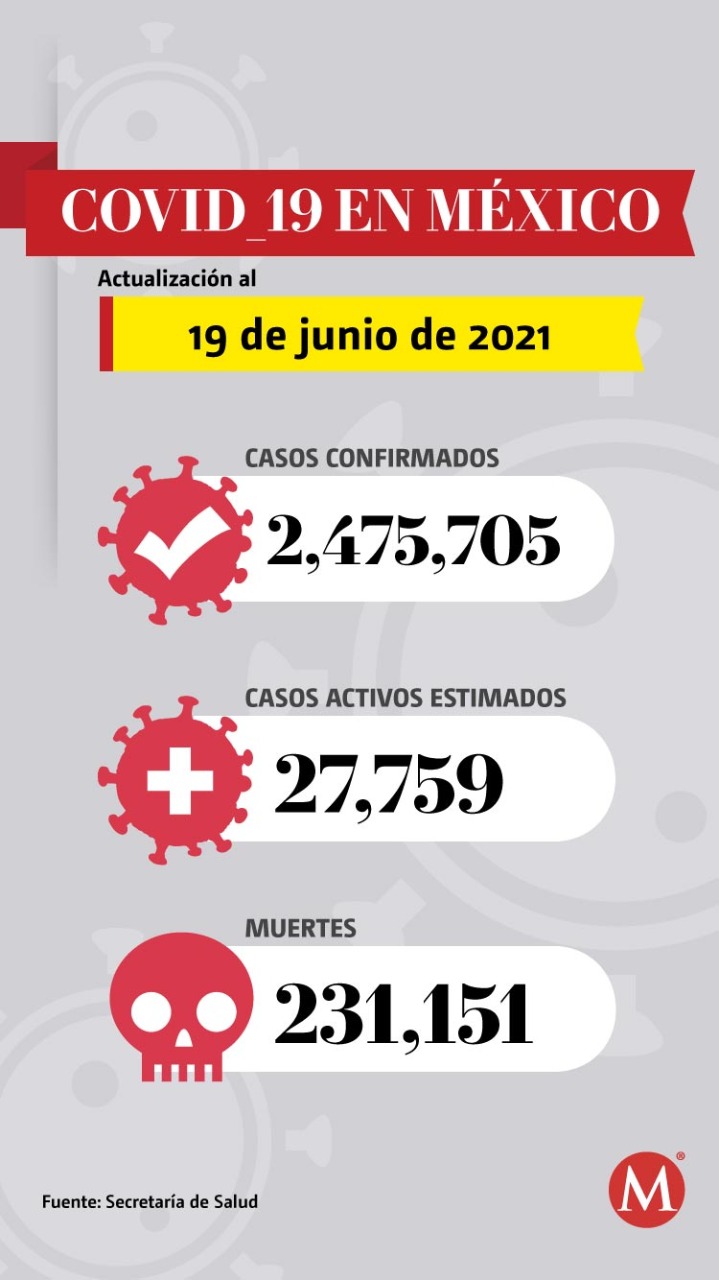 La Secretaría de Salud informó este sábado sobre las cifras de covid-19 en México, con corte al 19 de junio, en el que se sumaron 192 muertes en las últimas 24 horas.