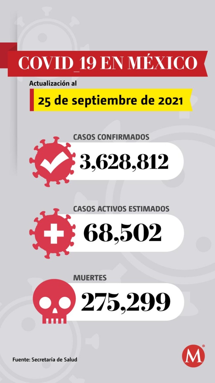 México suma 275 mil 299 muertes por covid-19 y registra 3 millones 628 mil 812 casos acumulados de coronavirus SARS-CoV-2, de acuerdo con el informe técnico de la Secretaría de Salud publicado este sábado en el que se añadieron 9 mil 697 nuevos casos en 24 horas y hay 596 muertes adicionales.