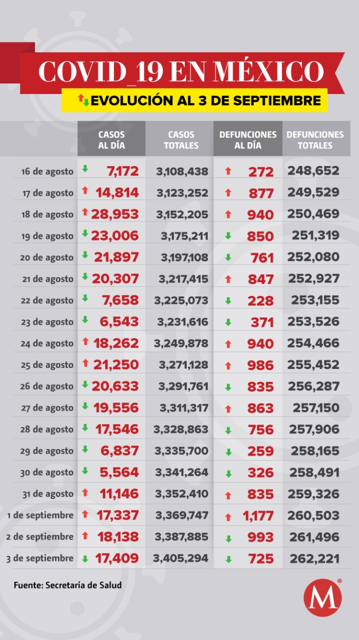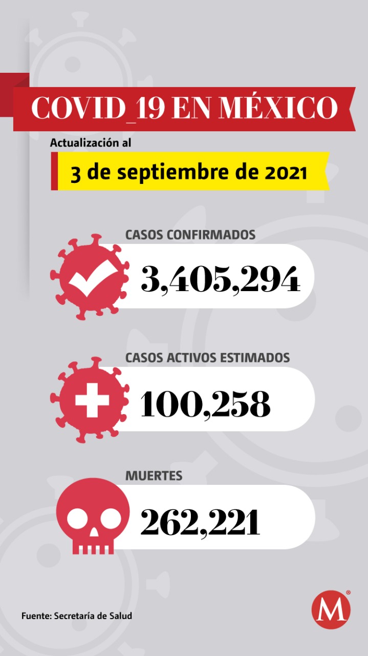 México suma 262 mil 221 muertes por covid-19 y registra 3 millones 405 mil 294 casos acumulados de coronavirus SARS-CoV-2, de acuerdo con el informe técnico de la Secretaría de Salud publicado este viernes en el que se sumaron 17 mil 409 nuevos casos en 24 horas y hay 725 muertes adicionales.