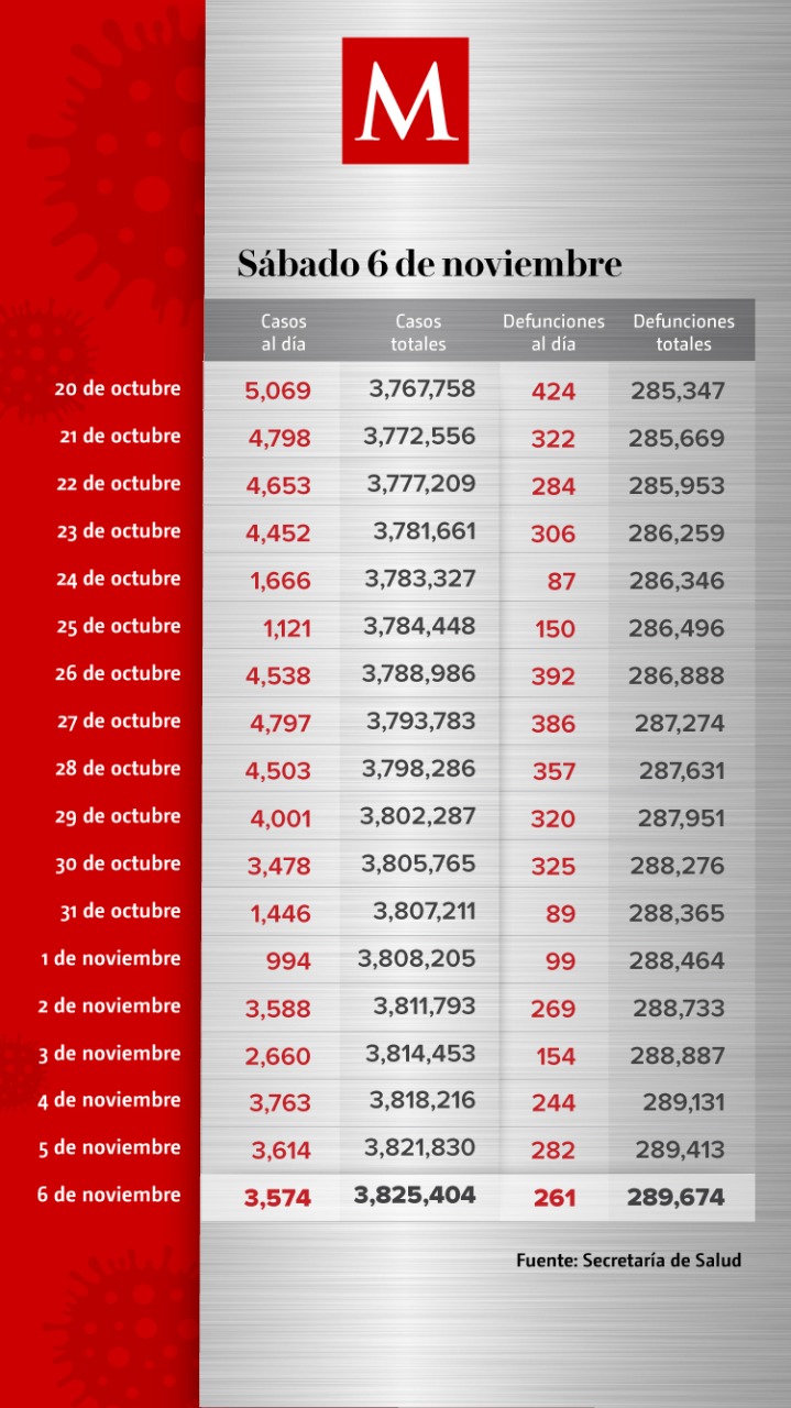 México suma 289 mil 674 muertes por covid-19 y registra 3 millones 825 mil 404 casos acumulados de coronavirus SARS-CoV-2, de acuerdo con el informe técnico de la Secretaría de Salud publicado este sábado en el que se añadieron 3 mil 574 nuevos casos en 24 horas y hay 261 muertes adicionales.