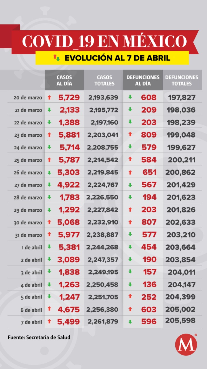La Secretaría de Salud informó este sábado sobre las cifras de covid-19 en México, con corte de este 7 de abril, donde se confirmaron 596 decesos en las últimas 24 horas.