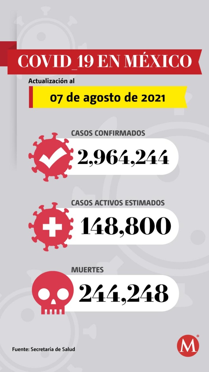 México suma 244 mil 248 muertes por covid-19 y registra 2 millones 964 mil 244 casos acumulados de coronavirus SARS-CoV-2, de acuerdo con el informe técnico de la Secretaría de Salud publicado este viernes en el que se sumaron más de 20 mil nuevos casos en 24 horas, hay 515 muertes adicionales.
