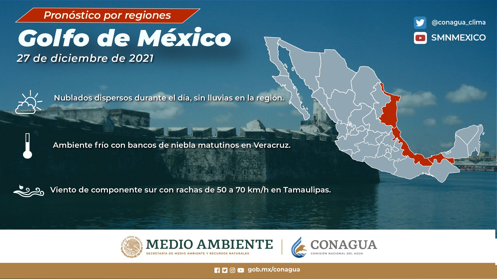 El pronóstico del tiempo para este lunes 27 de diciembre es cielo nublado disperso durante el día y 'surada' de hasta 50 a 70 km/h en Tamaulipas.