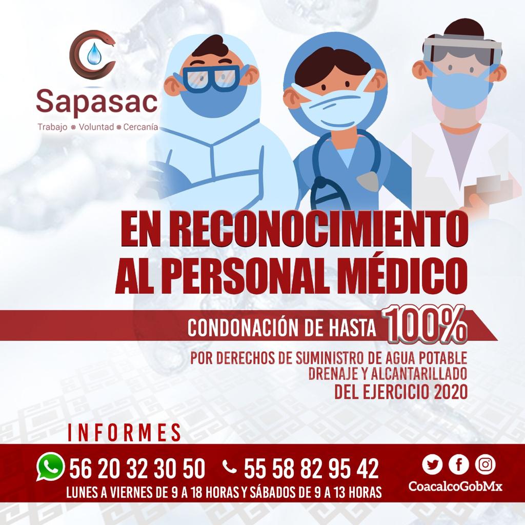 Los integrantes del Cabildo del municipio de Coacalco aprobaron la condonación en el pago de derechos por suministro de agua potable, drenaje y alcantarillado a todas las personas que comprueben ser médicos o enfermeros, y que se encuentren al corriente en el pago de su contribución por este rubro hasta el año pasado.