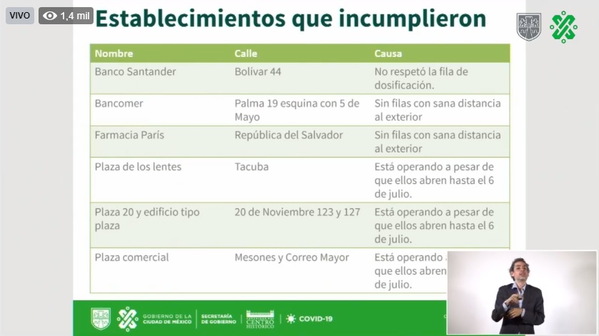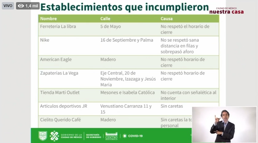 El gobierno de la Ciudad de México reveló el nombre de algunos establecimientos que incumplieron las medidas en el Centro Histórico. Entre ellos están Ferretaría La Libra, Nike, American Eagle, Martí, Cielito Querido Café, Santander, BBVA, Farmacia París y Plaza 20.