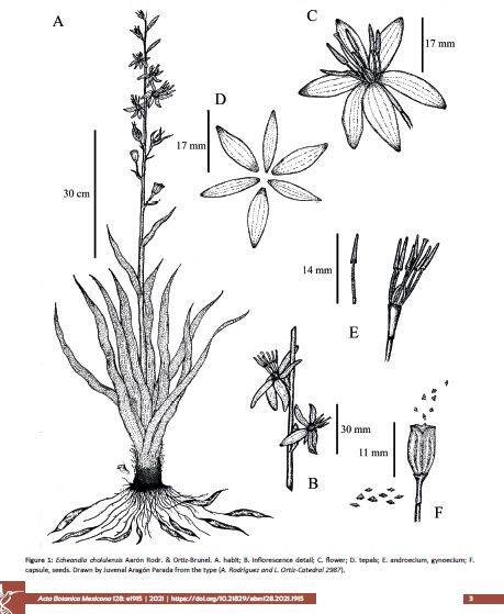 Fue cuando acudieron al Herbario Nacional de México, un acervo de la Universidad Nacional Autónoma de México (UNAM), en donde encontraron un par de colectas de Echeandia hechas en 1970, esto en la Zona arqueológica de Cacaxtla-Xochitécatl, aunque no tenían un nombre en ese momento.