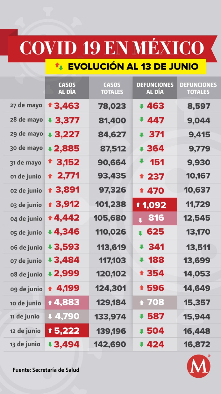Las muertes por coronavirus, al corte del 13 de junio, aumentaron a 424, es decir hay un acumulado de 16 mil 872 defunciones por covid-19, enfermedad ocasionada por el virus SARS-CoV2, mientras que los contagios se incrementaron a 3 mil 494, por lo que hay un acumulado de 142 mil 690 contagios.