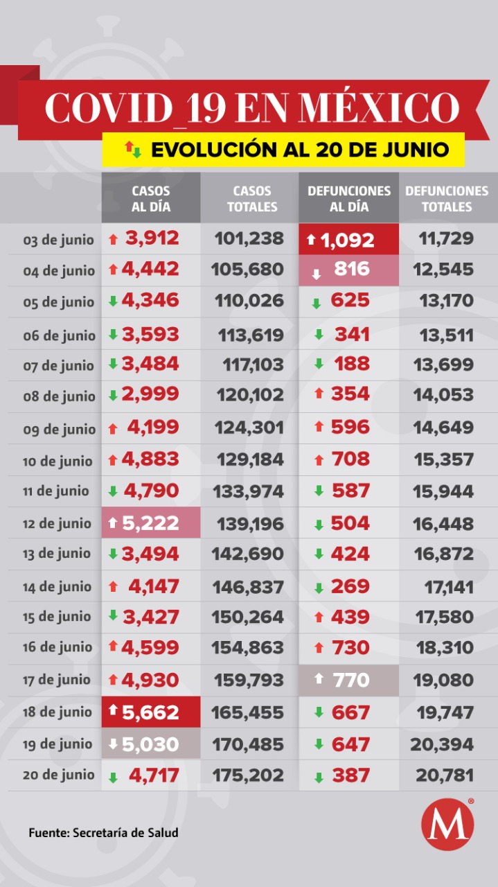 Las muertes por coronavirus, al corte del 20 de junio, aumentaron 387, es decir hay un acumulado de 20 mil 781 defunciones por covid-19, enfermedad ocasionada por el virus SARS-CoV-2, mientras que se registraron 4 mil 717 nuevos casos, por lo que hay un acumulado de 175 mil 202 contagios.