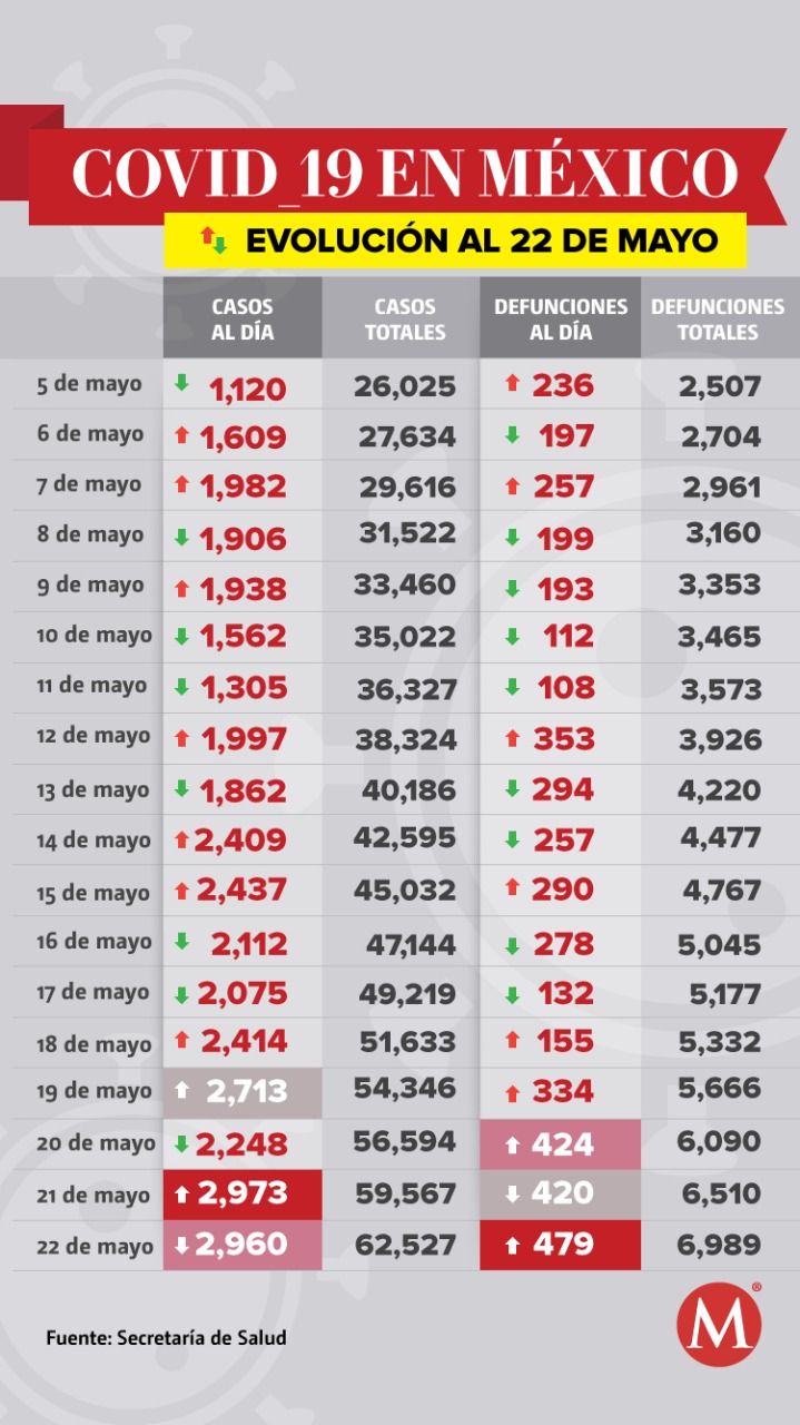 En el último día, al corte del 22 de mayo, las muertes por coronavirus aumentaron a 479, es decir un acumulado de 6 mil 989 defunciones por covid-19, ocasionada por el virus SARS-CoV2, mientras que los contagios se incrementaron a 2 mil 960, por lo que hay un acumulado de 62 mil 527 contagios.