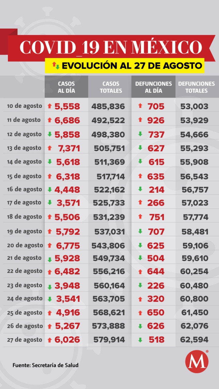 Las cifras al corte del 27 de agosto: