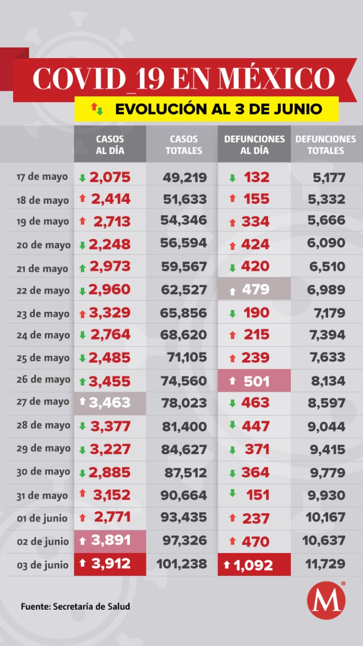 En México, al corte del 3 de junio, van 11 mil 729 muertes y 101 mil 238 casos confirmados de coronavirus, de los cuales 16 mil 829 son activos y 44 mil 869 más son clasificados como sospechosos, informó la Secretaría de Salud en conferencia de prensa sobre el avance de la epidemia.