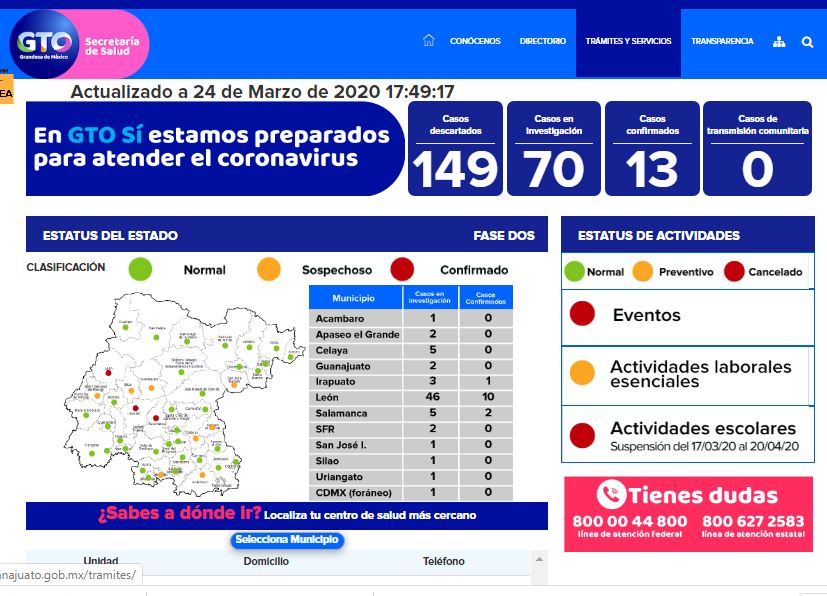 De acuerdo a información proporcionada por la Secretaría de Salud de Guanajuato, hasta el momento se reportan trece casos confirmados por Covid-19 en el estado, 70 más se mantienen en investigación, y han sido 149 los casos descartados.